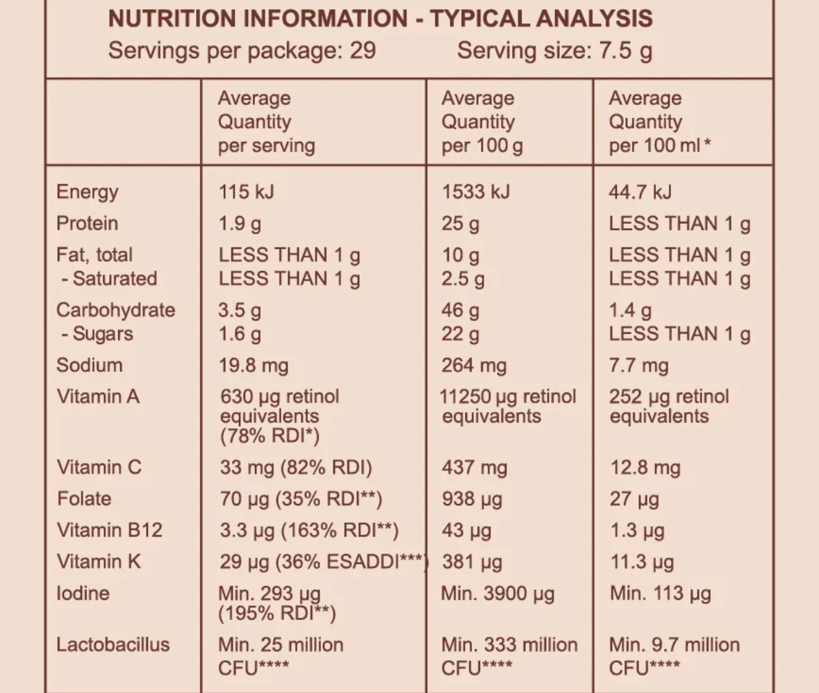 100% organic fermented blend powder (red lentils, camu camu, broccoli, chlorella, spinach, pepitas, beetroot, molasses), organic beetroot juice powder, organic freeze dried grass fed and free range beef liver powder, organic Atlantic kelp powder, sweetener (naturally occuring organic steviol glycoside within stevia powder).
