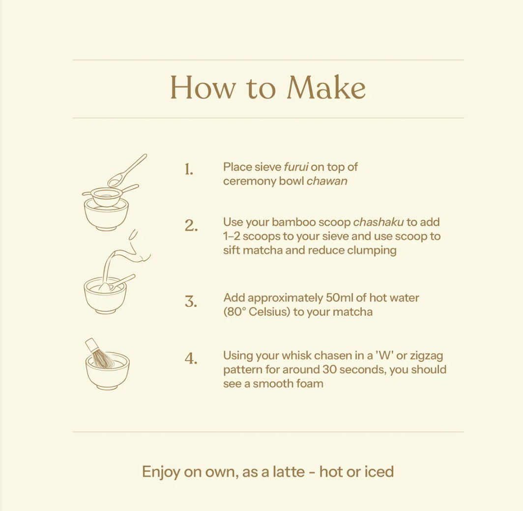 Our matcha is more than just a boost of energy, it’s a daily ritual to support clarity, calm, and connection. Sourced from the nutrient rich fields of Uji, Japan and stone-ground in small batches, this is matcha in its purest form. Whether you whisk it traditionally or blend it into your morning, it’s a gentle way to energise your day, without the jitters or crash.